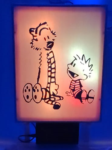Voor een secret santa maakte we een lichtgevend canvas met afbeelding van Calvin & Hobbes.